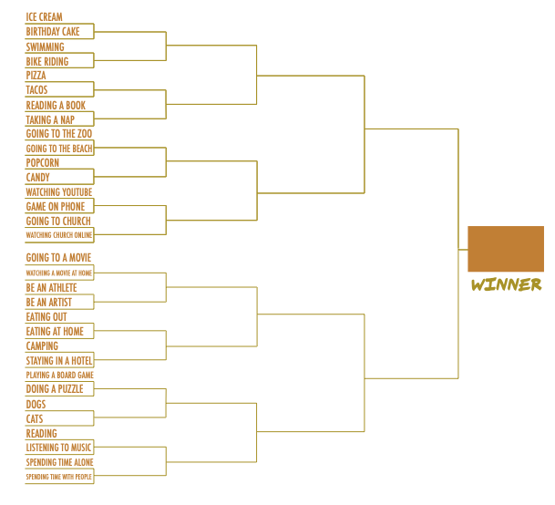 This “Family Fun Bracket” is designed to help parents lead their kids and the entire family in a little fun, hoping to have some light-hearted conversations and debates.