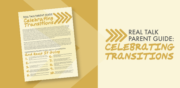This Real Talk Parent Guide: Celebrating Transitions is designed to help you be intentional with setting aside some time to create an open-ended conversation with your kids utilizing the conversation prompts provided. This is not supposed to be a forced interview or interrogation. Have fun with it! Let your child respond to the question, and then let them ask your response to the same question. Maybe prepare a special meal, go out to a favorite restaurant, or plan a special excursion where you can discuss these questions. Whatever you do, make the time to simply engage in an intentional conversation that will help your child see some things they may not normally see and begin to prepare for some things that will be coming their way.