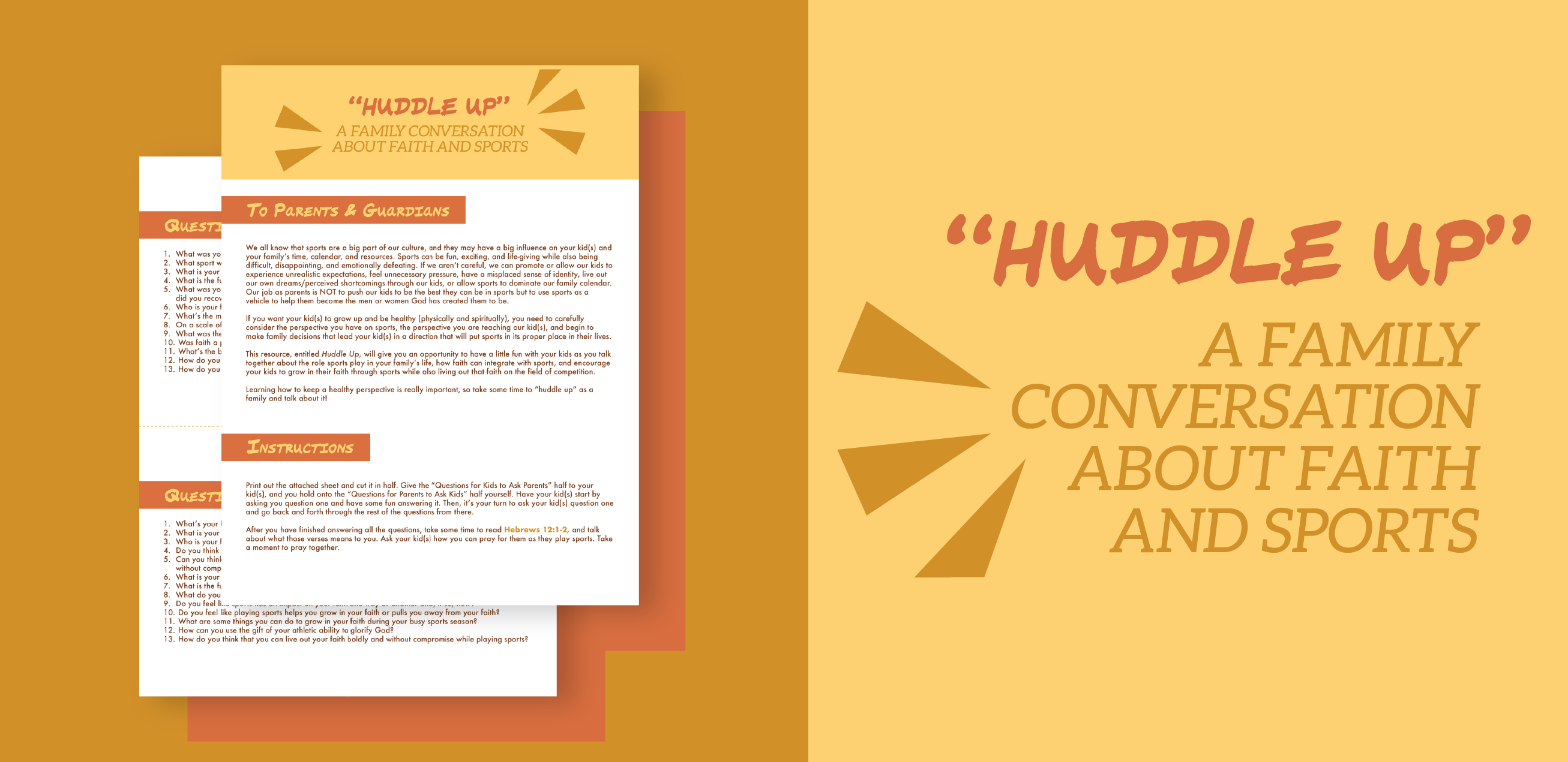 This resource, entitled Huddle Up, will give you an opportunity to have a little fun with your kids as you talk together about the role sports play in your family’s life, how faith can integrate with sports, and encourage your kids to grow in their faith through sports while also living out that faith on the field of competition.